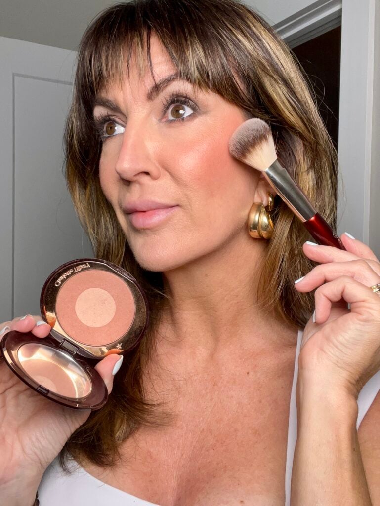 I nailed it with >> Charlotte Tilbury Cheek to Chic blush in “Pillow Talk,” $42. We didn’t see a ton of bright pink, coral, or red blushes in the ’90s like we do nowadays. The vibe was definitely more muted, and blush was used almost like we use a contour product today. Just to define the cheekbones in a striped motion. I can’t think of a better blush shade than this one to recommend for anyone scared of bright blush. This “Pillow Talk” shade provides just a bit of warm-nude-pink and radiance. This blush is AMAZING.