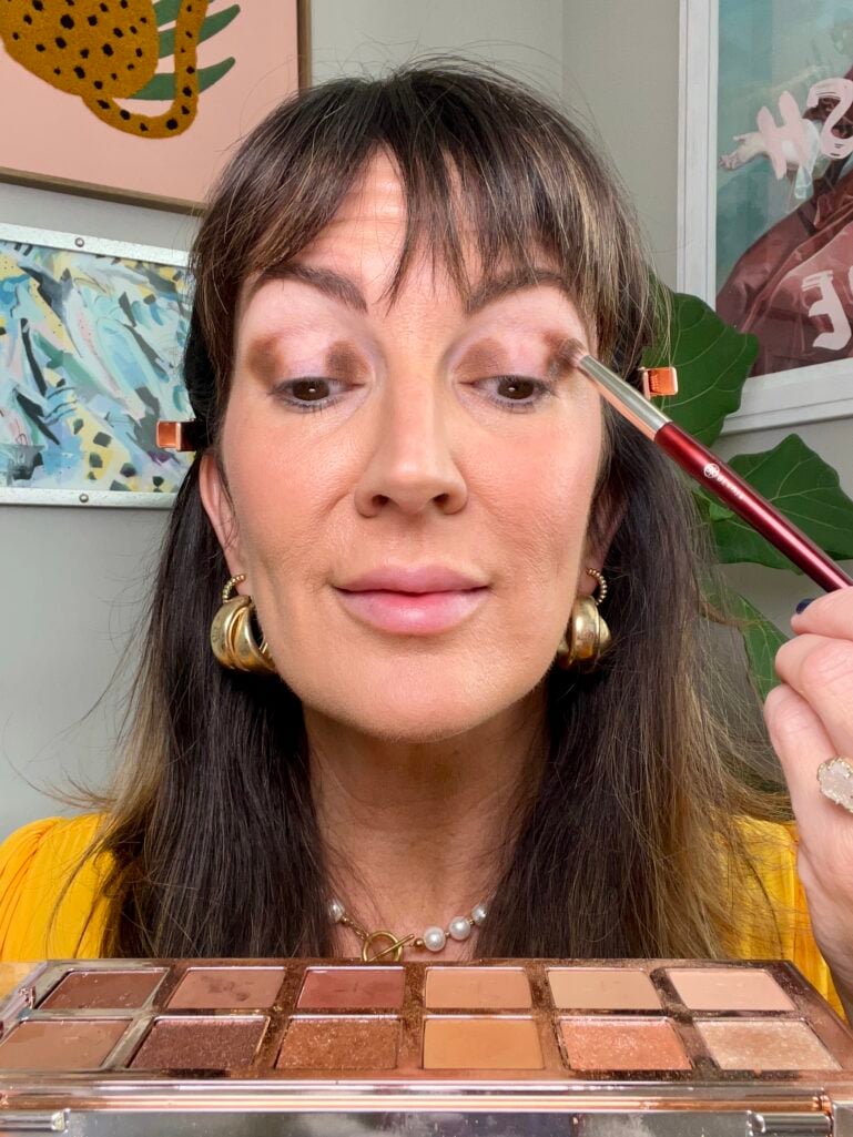 2. Place your depth. Take your darker matte shade and pack it on the inner and outer corners of your lid with your rounded brush. Don’t go too high — keep it lower than the crease so the shape stays rounded. I used the lighter cream brown first when using the Patrick Ta palette, then added the powder shadow, but you can go straight to the powder if you aren’t using this palette.