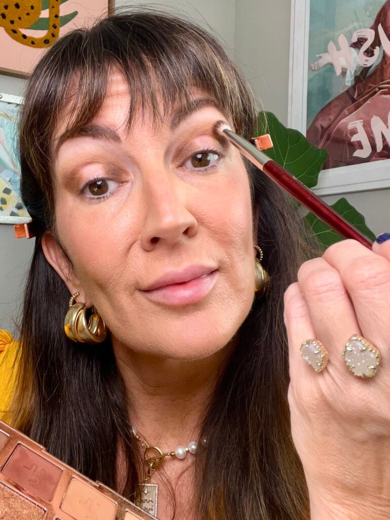 5. Press on the shine. With a small flat brush or your fingertip, tap your shimmer right in the center of your lid. Blend the edges lightly so it melts into the darker shades — you don’t want a harsh line. Add a touch of it also tightly around the tear duct area.