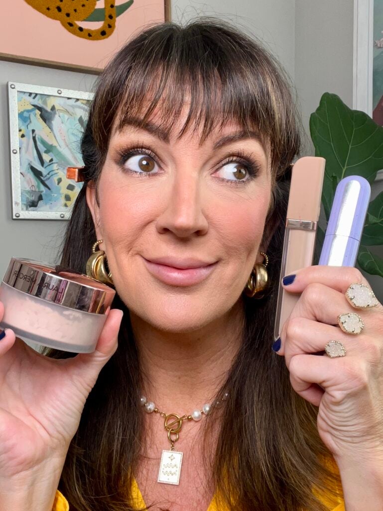 I finished off my look with: Patrick Ta Major Skin Hydra Luxe Foundation in shade “12 peach”, $58, Natasha Denona Hyglam concealer (of course!) in shade N2,$30, Laura Mercier loose powder in “rose”, $48, L’Oreal Lumi Liquid blush in “glowy true rose”, $10 ( new favorite drugstore blush formula), and my lip cream is Buxom Cosmetics in “Hot Toddy” (this is a wonderful neutral shade that is easy for anyone to pull off – highly recommend this color), $25 // Similar yellow/mustard/orange silk shirts here Banana Republic, $119 and Boston Proper $60 here, Kendra Scott knuckle ring, $140, Clara pearl choker necklace, $130.
