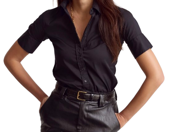 Shop THE DAILY Look The Shirt by Rochelle Behrens, Madewell Kickout Crop Jeans, Rothy’s The Double Bit Driver, Medium Black Shoulder Bag YSL scroll