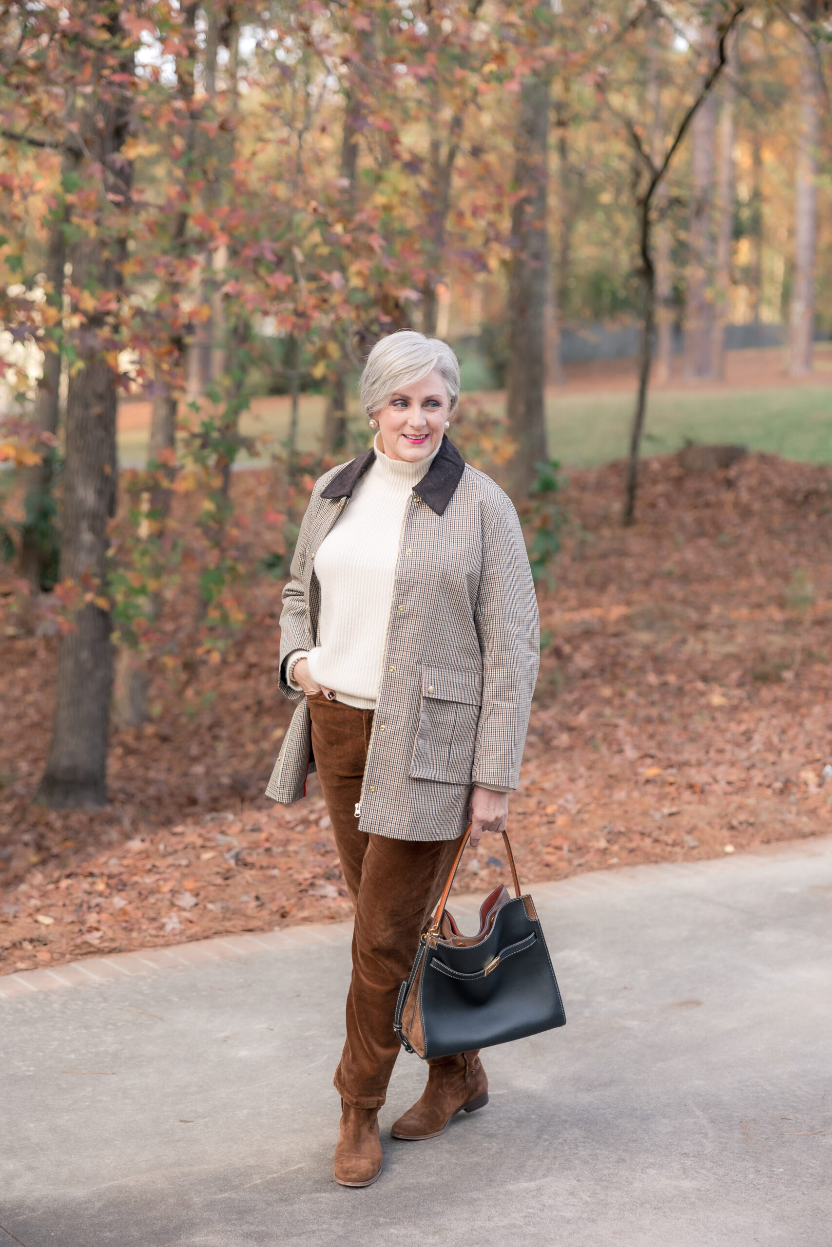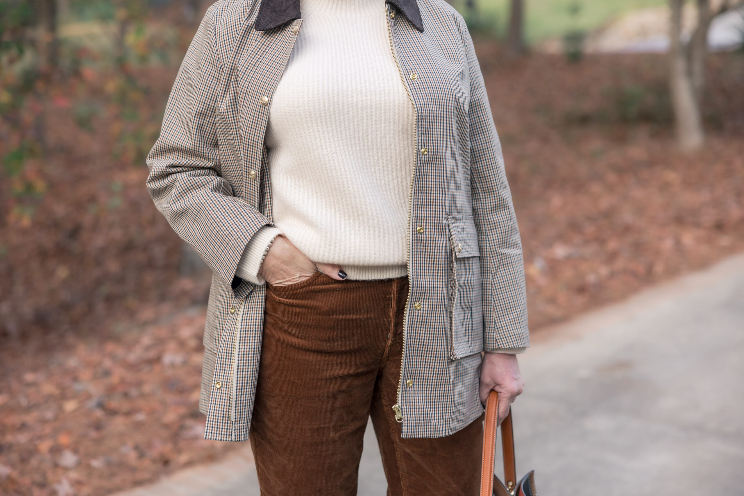Cashmere Turtleneck Sweater | Corduroy Pants | Heritage Barn Jacket | Suede Boots (old, similar here and here) | Leather Handbag | Caviar Lattice Ball Bracelet | Beaded Bangle | Caviar Watchband