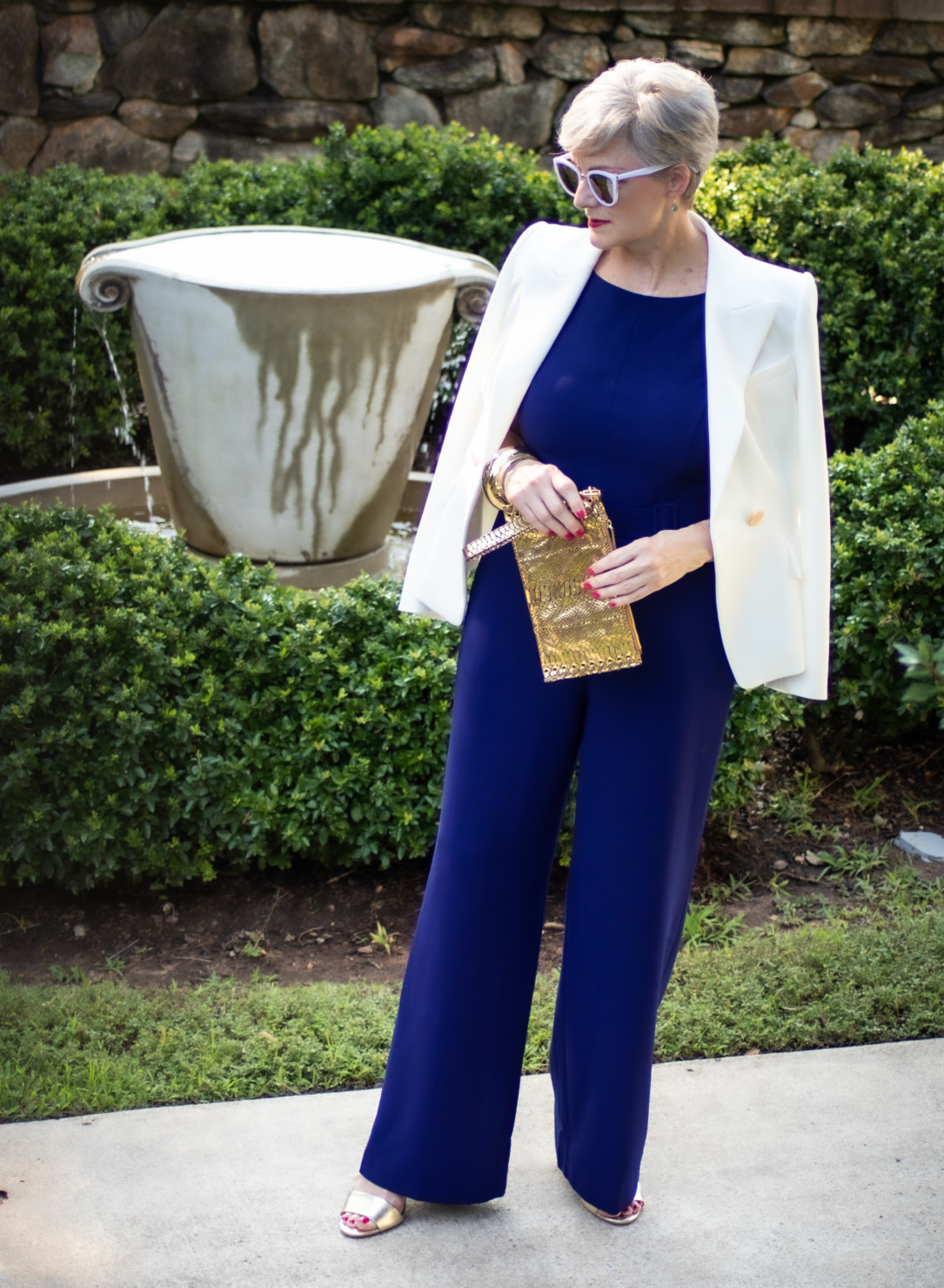 if it’s august that means there are three birthdays to celebrate in our family. which is as good an excuse as any to look for a cute evening outfit like this blue jumpsuit from Vince Camuto and white blazer (similar here and here) that’s been on style repeat all year long. for whatever reason, i’ve been on a Vince Camuto kick, but i do like this affordable clothing brand.