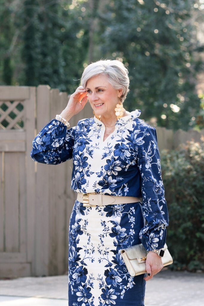 Let the print be the outfit. When I wear the navy floral set, there’s very little else to think about. Strong accessories, clean footwear, and done. A bold print actually simplifies your getting-dressed routine because the outfit makes its own statement.