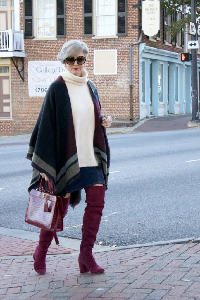 it’s boot season and there are lots of choices this year. today, i’m sporting a pair of suede over the knee boots. but this winter you’ll find velvet boots. take a look at this casual pair. love patterns? patterned boots are on trend as are studded boots or grommets. who remembers go-go boots that were popular during the swinging sixties? yes, i owned a pair that i wore with a pleated skirt and iowa hawkey sweatshirt… guess what? white boots are back but in a sophisticated way. how about patent leather boots? you’ll find those in stock this year as well as sock boots. check out jeffrey campbell and marc fisher if you’re dipping one toe into trend waters. these are brands that won’t break the bank.
