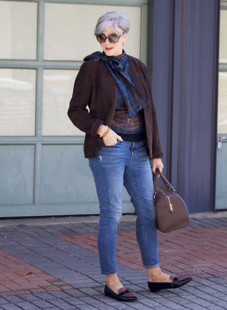 Love the rich brown suede jacket, great handbag and blouse (the background of black watch plaid is one of my favorites!) I can never find beautiful brown clothing anymore in NYC. The stores neutrals are almost always black, grey and sometimes navy. Have a great visit to NYC – great walking weather this week!