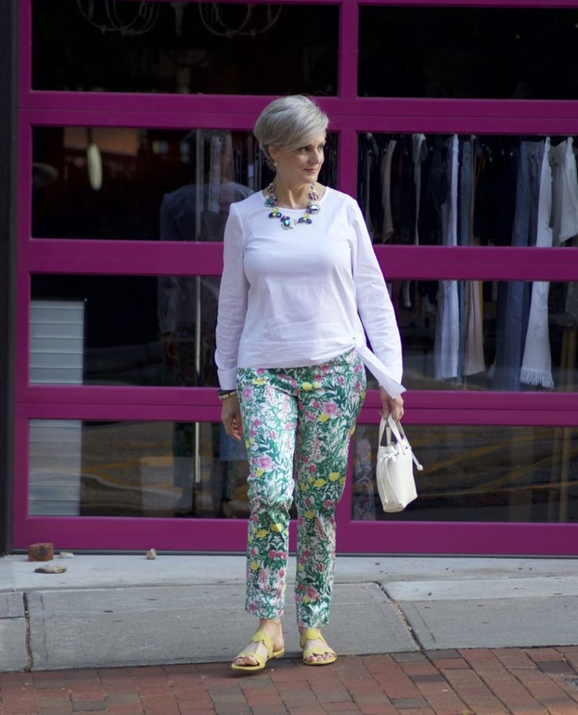 last month, i spied these adorable slim fit garden print pants. with a sale this good, it was time to pull the trigger. in for a penny in for a pound as my mother used to say so this side tie blouse came home with me too. it adds subtle sophistication to today’s casual chic outfit. afraid of prints? pair a print with a solid color for a polished but together look. it always works.