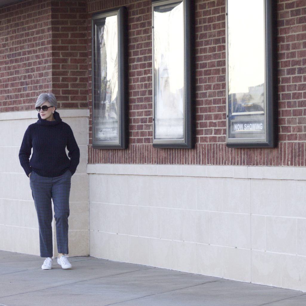 now and again i love to switch out my beloved blue jeans for a different sort of casual look. since sneakers are so on-trend (when were they off trend?) and such a comfortable shoe choice, i thought i’d pair them with a plaid trouser. a simple cable knit turtleneck is the perfect option for a beautiful day with temps in the 60’s. look ma, no coat! i won’t be smug for long as i’m headed to minneapolis this weekend where the temps are hovering right around 0…