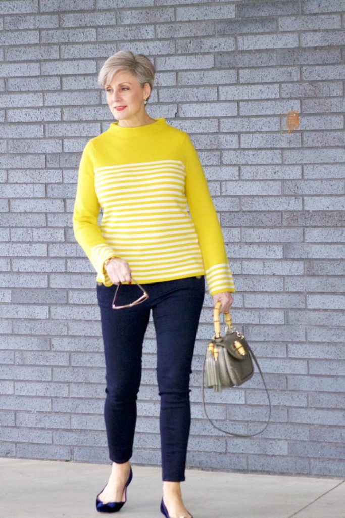 today’s ootd is easy peasy as i paired this bold stripe sweater from Boden with my new sailor denim from Ann Taylor and called it a day. the sweater comes in yellow or blue. notice the flattering neckline and bell sleeves that add interesting details. and i love how the sleeves have stripes at the cuff. it’s always small details like these that set an item apart. ballet flats similar here add a casual vibe that’s perfect for a day chock full of errands. and guess what? this outfit is finished with three easy pieces. didn’t i tell you it was easy peasy?
