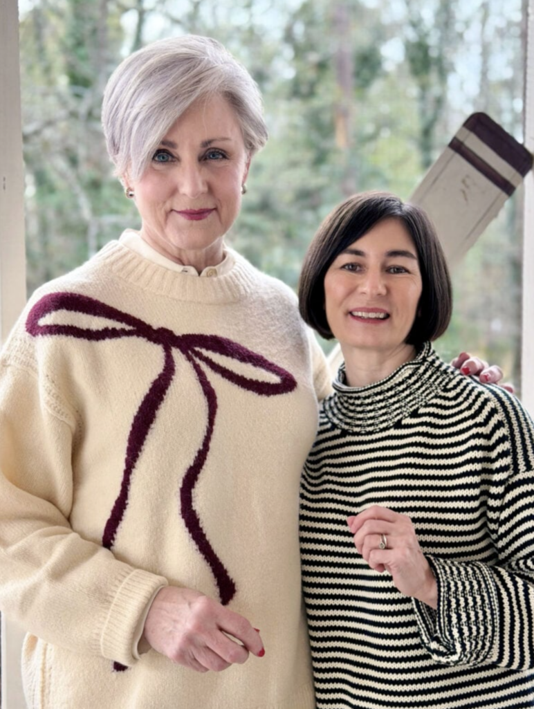Want to see chunky knits styled in real outfits? My recent post Oscar’s Hot Toddy & Bacon-Wrapped Dates: Fireside Favorites features both Kelly and me wearing chunky knits in completely different ways—Kelly in her striped turtleneck with green corduroys and sneakers, me in my bow-print sweater with velveteen pants and riding boots. Both outfits show how to balance texture and volume for flattering proportions.