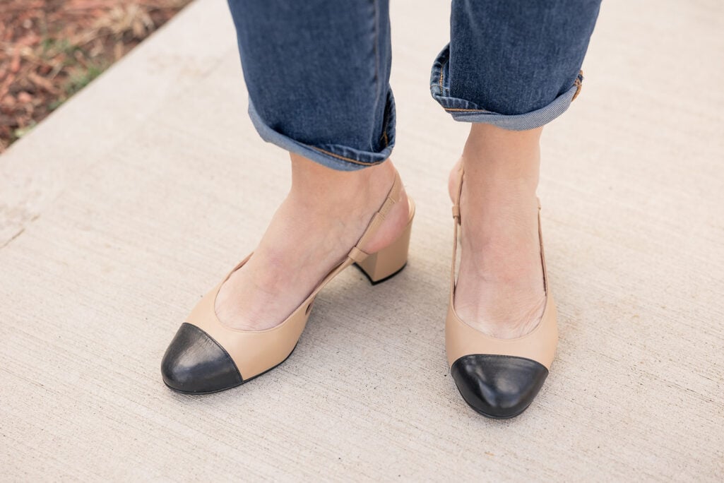Eldof Two-Tone Slingback Block Heels – ~$60 (Amazon) The classic cap-toe two-tone look on a pointed toe with a low block heel. Clean lines, simple slingback strap, and that beige-and-black color combination that does all the heavy lifting. Available on Amazon and easy to find in your size.