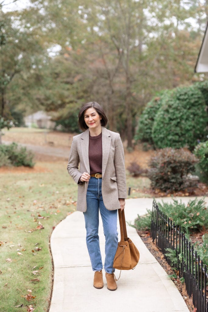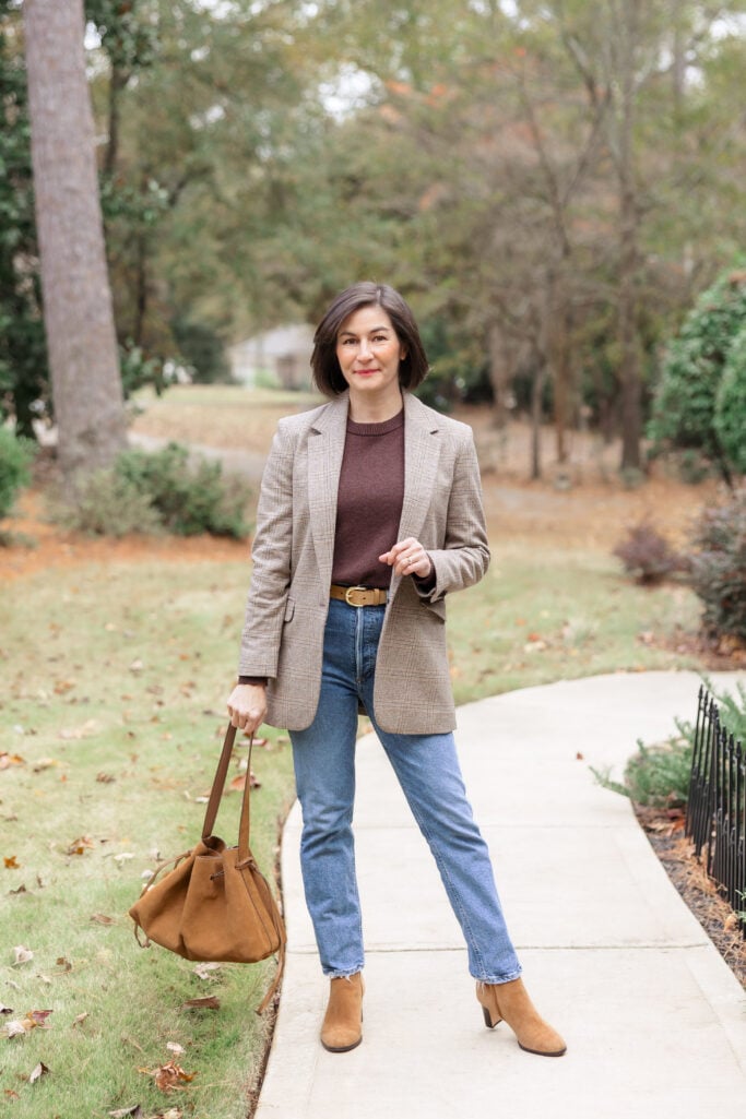 The longer length of this blazer actually works in our favor. It creates a lengthening vertical line without overwhelming our proportions, especially when worn open over a tucked or half-tucked sweater.