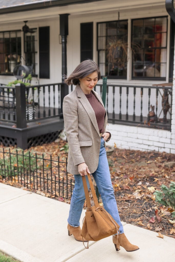 Perfect Cashmere Sweater | Agolde Pinch Waist Crop Jeans | Classic Belt in Suede | Mercer Relaxed Blazer | Rosalind Ankle Boots in Suede | Drawstring Shoulder Bag