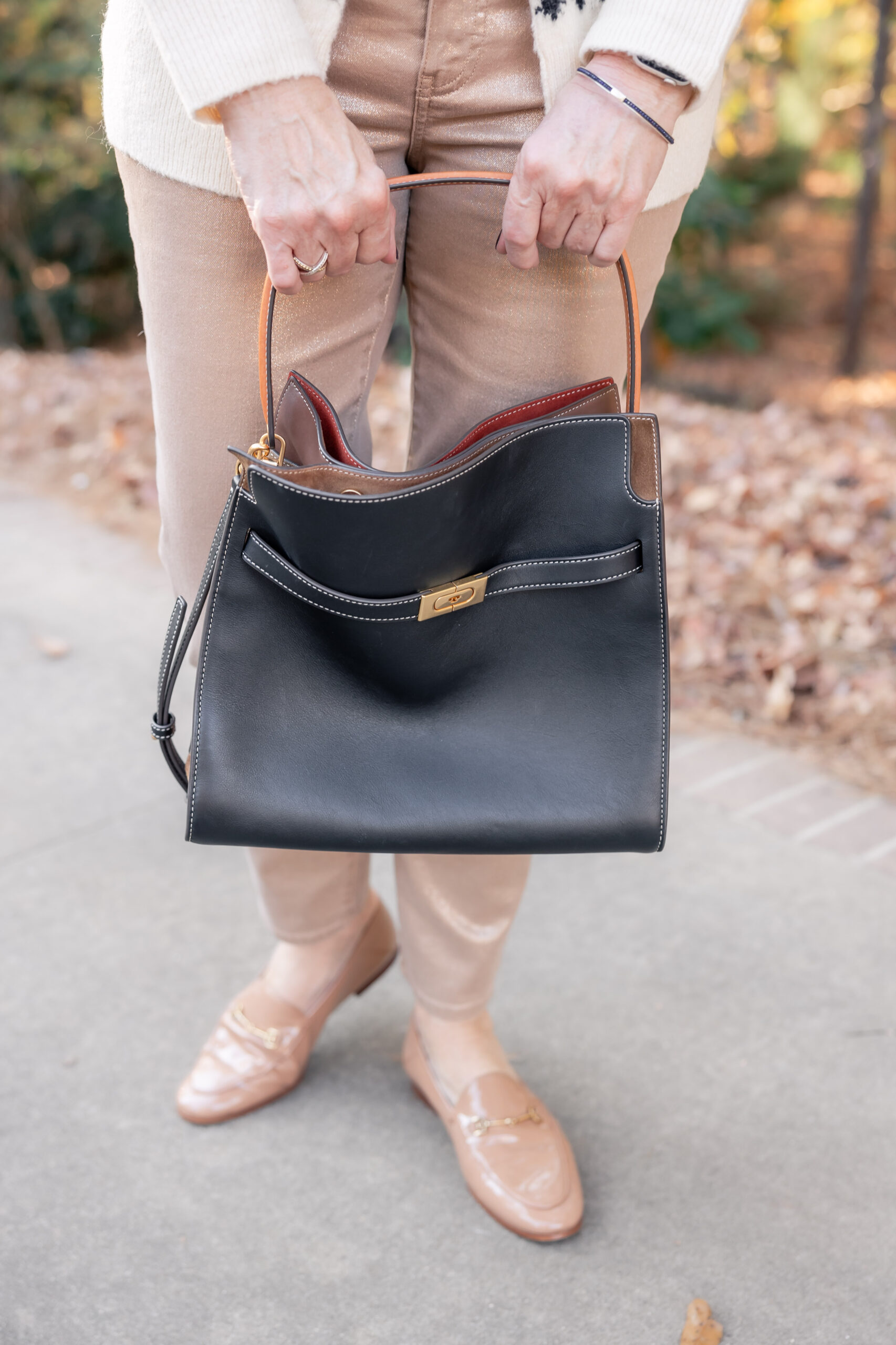 The foil jeans are back in action because they’re so darn cute and comfy and go with everything, as well as the patent leather horse-bit loafers. And I have to admit my favorite handbag come fall and winter is the Lee Radizwill from Tory Burch. It’s a great size with two handles, and I love that the suede tan insets complement the black leather.