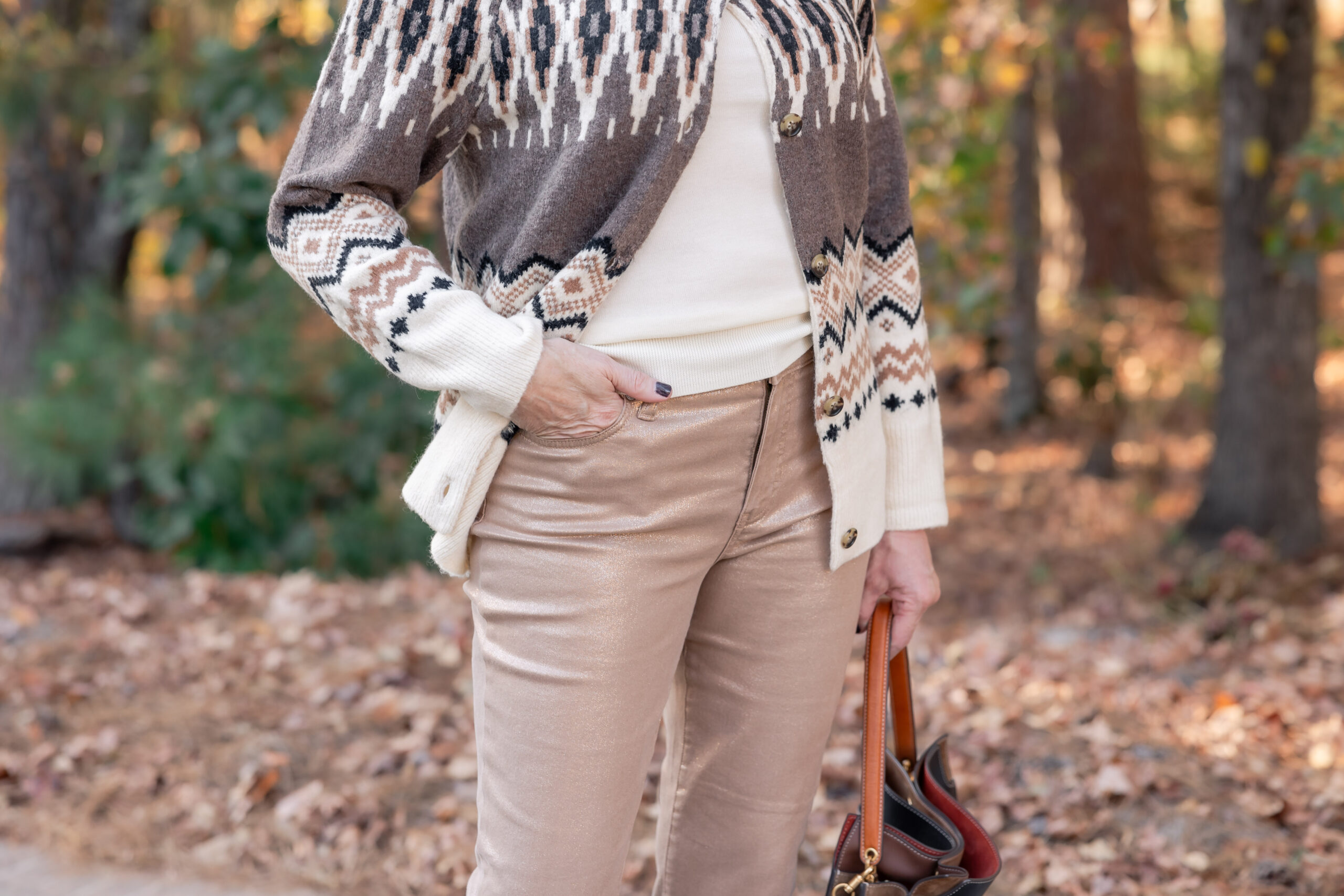 Foil Jeans | Ivory Turtleneck | Fair Isle Cardigan (old, similar here, here, and here) | Patent Leather Loafers | Black Leather Handbag | Watchband | Bangle | Earrings