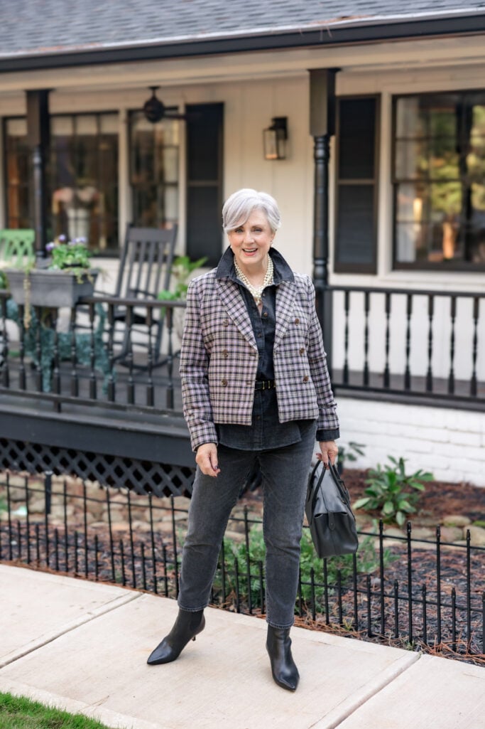 If you’re heading out to a holiday lunch or a gathering that calls for a little more refinement, elevated casual is your sweet spot. Take a charcoal denim shirt, define the waist with a belt, and layer on a plaid blazer. Add a pearl necklace for contrast — the shine of pearls against matte denim instantly elevates the look.