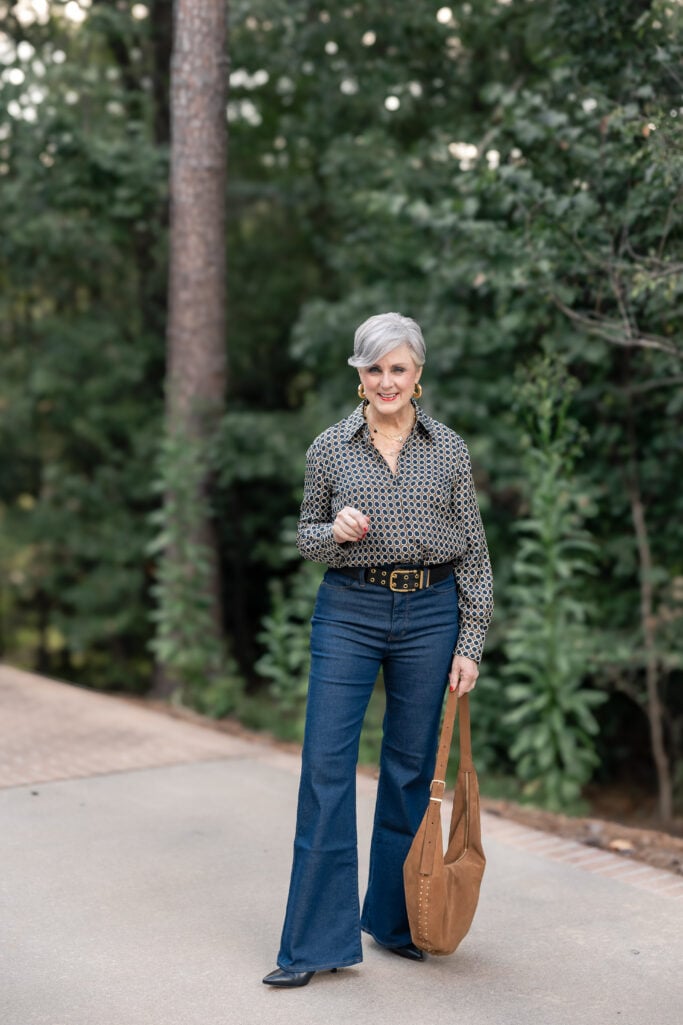 For a slightly different take, try a printed blouse tucked into dark flared jeans. The structured silhouette and wide belt bring balance and shape, while a suede bag softens the ensemble.