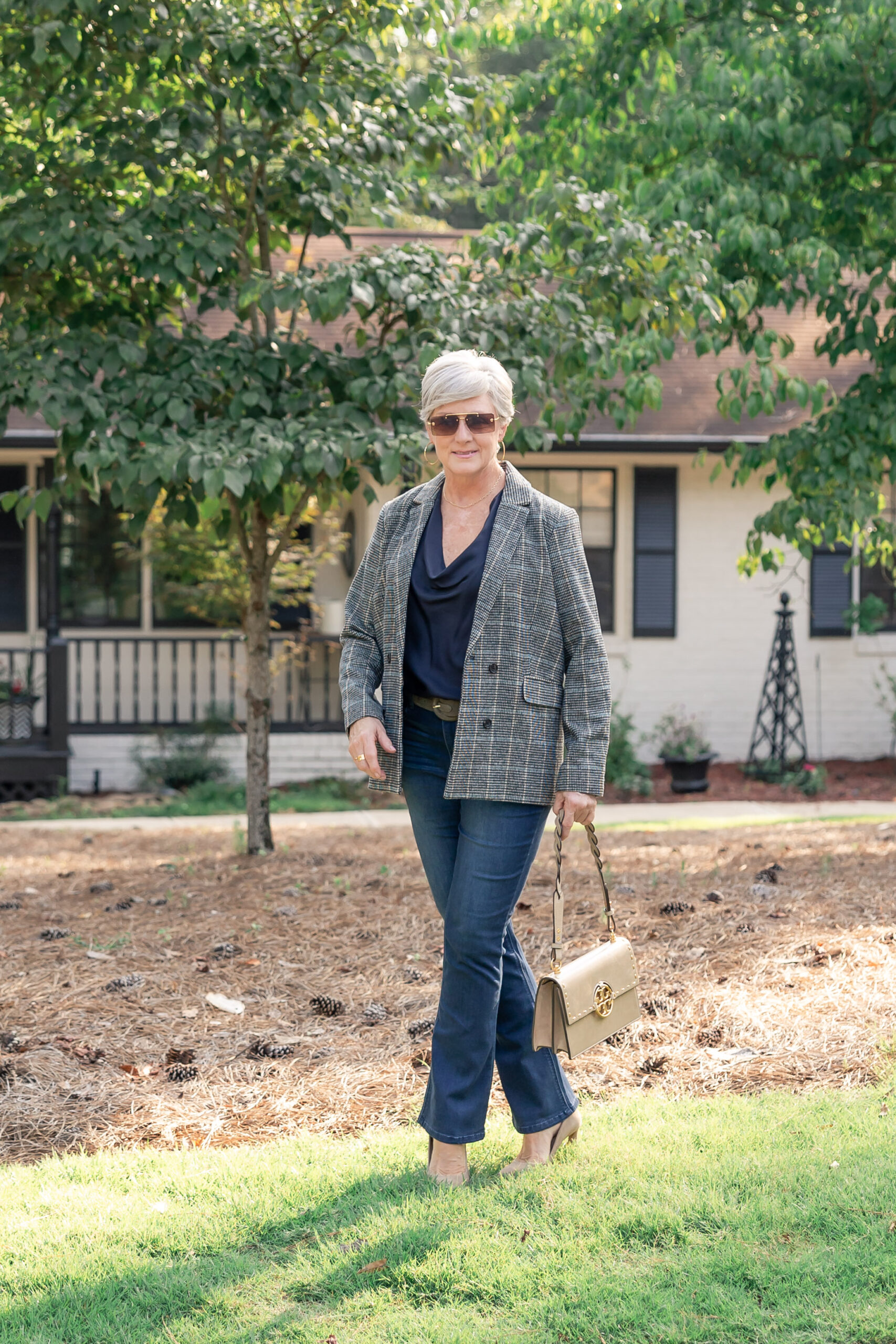 Glen Plaid Blazer | Cowl Neck Blouse | Denim | Similar Handbag | Similar Suede Pumps | Similar Sunglasses | Earrings