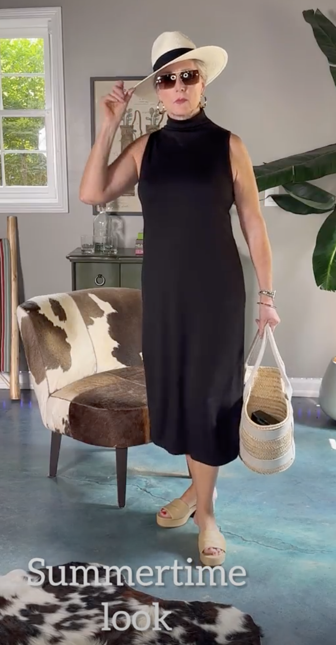 Black Dress | Sandals | Straw Hat | Straw Tote | Similar Sunglasses
