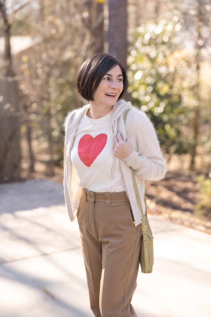 Sézane Ancelin Trousers | J.Crew Brushed Cashmere Zip-Up Sweatshirt | Similar Heart Graphic Tee | J.Crew Vintage Jersey Crewneck Tee | Gola Badminton Sneakers | Similar Woven Crossbody Bag