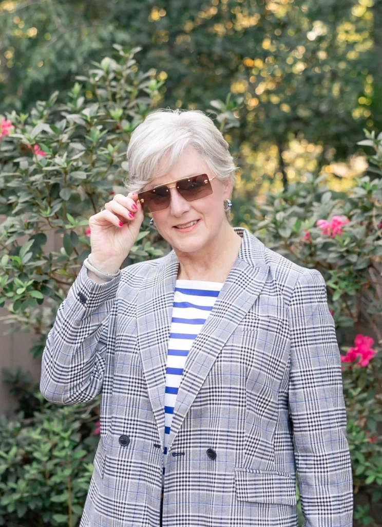 This is the combination I reach for most often — and the one I recommend if you’re just getting started. Stripes and plaid are both classic patterns, and when they share a color (here, it’s the blue), they look like they were made for each other. The key is scale: the thin stripes on the tee play nicely against the larger windowpane plaid of the blazer.