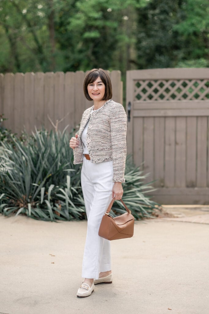 Not at all — it’s all in how you style it. Paired with a simple white tee and linen trousers as I’ve done here, it reads effortlessly polished rather than formal. The key is keeping everything underneath relaxed and understated. A tweed lady jacket is also a beautiful way to dress up your denim!