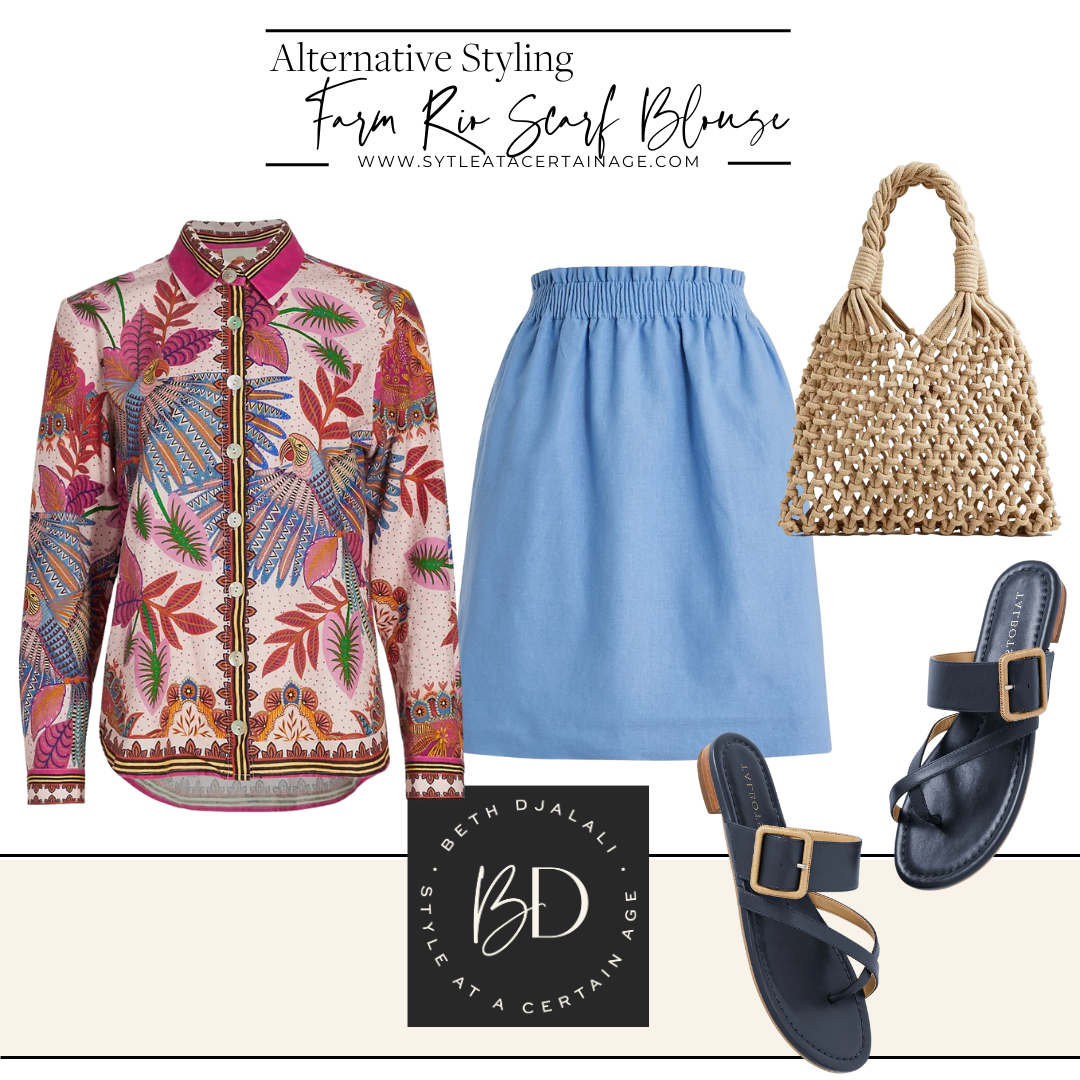 Left Board: Farm Rio Scarf Blouse | Straight Leg Pant in Linen-Cupro Blend | Strappy Block Heel Sandal in Metallic Leather | Acrylic Box Clutch Right Board: Farm Rio Scarf Blouse | Linen-Cotton City Skirt | Gia Buckle Nappa Sandals | Small Knotted Rope Tote