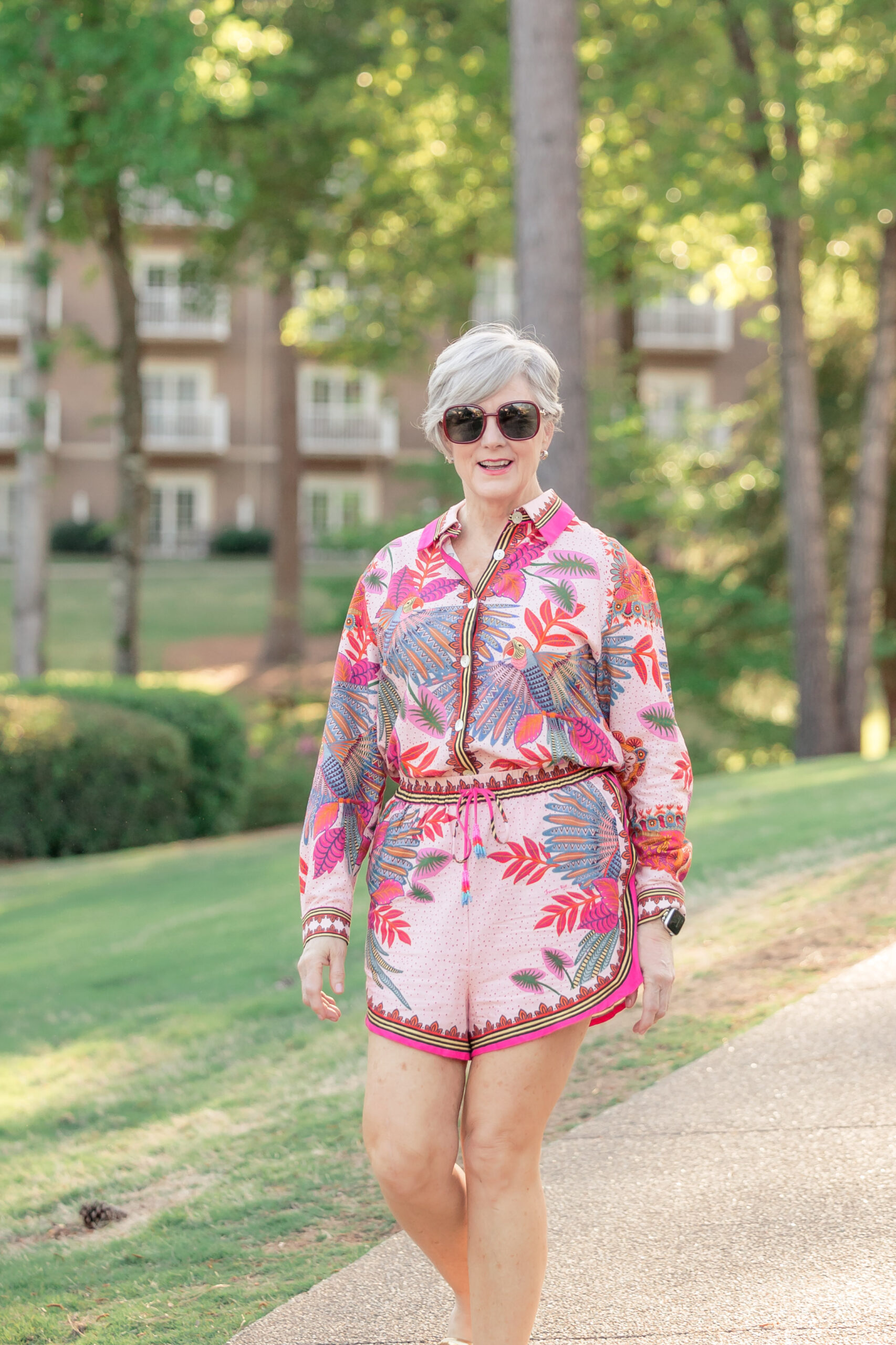 The bright 2 pc outfit from farm Rio and even the romper are so cute , but the long sleeves for summer Not so sure about it I guess you could put a tank under it and use it and a Jacket or Overblouse. I did purchase the Oliver miss color linen Bermuda short, tank, and blazer from banana republic and love it! Of course I love blazers and they are a nice coverup, You can take off the blazer and have just the tank if it’s warm. Hope you having a good time