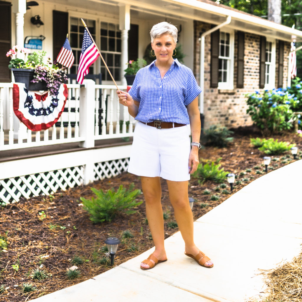 for a patriotic holiday, i like to wear something red, white, or blue. sometimes, i’m lucky and sneak in all three colors. sometimes, only one or two. today, i’m two out of three with a summery blue and white ensemble. how cute is this gingham blouse from Ralph Lauren available at Macy’s? today, it’s paired with white linen shorts also from Ralph Lauren that add a bit of sophistication thanks to the lining. brown sandals (similar here and here) and a brown belt (old, similar here and here) add a hint of sophistication. this simple ootd is perfect for a backyard bbq or a day of shopping. add a blazer, and it’s ready for an evening out.