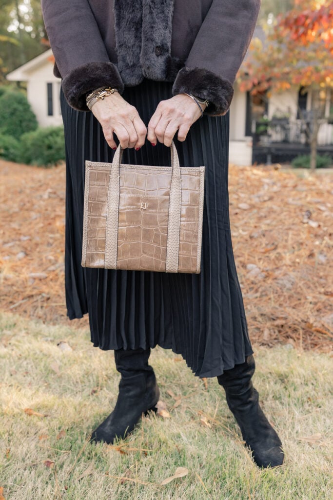 Croc-embossed bags, suede boots, metallic accents… these small touches make a big difference without breaking the color story.