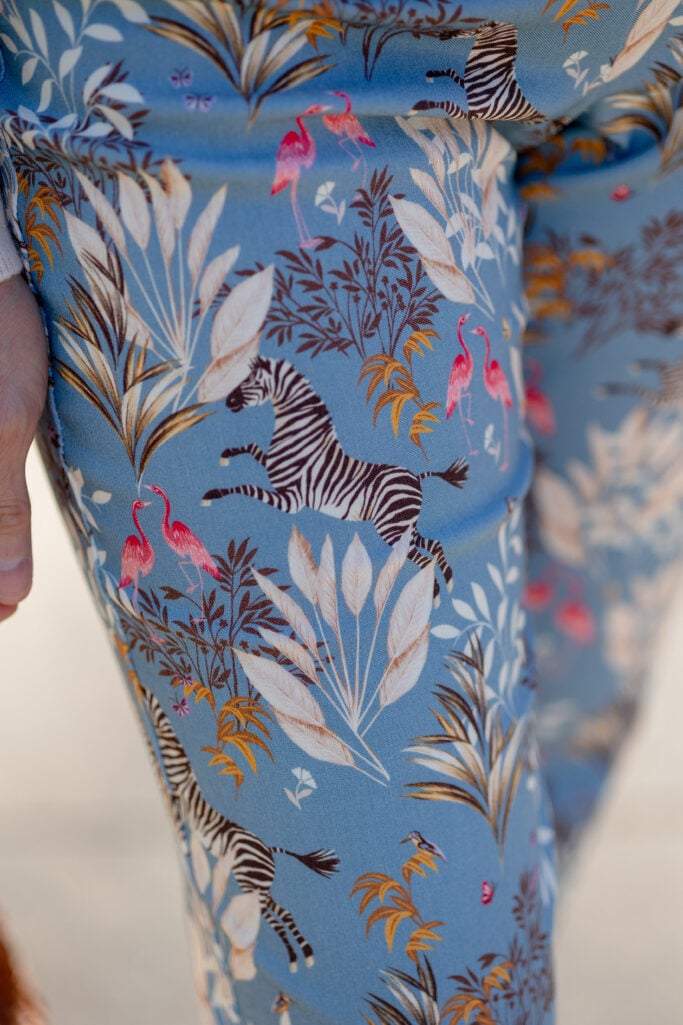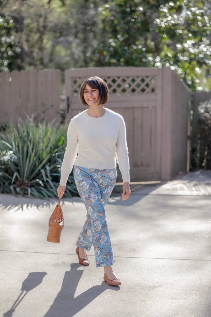 If you’re not wearing a cropped sweater (like I am today), I recommend a full or slight front tuck. The goal is to define the waist so the pants don’t visually “take over” the look. Because the Ivy Pants have a strong print, you want to make sure your proportions are still clear.