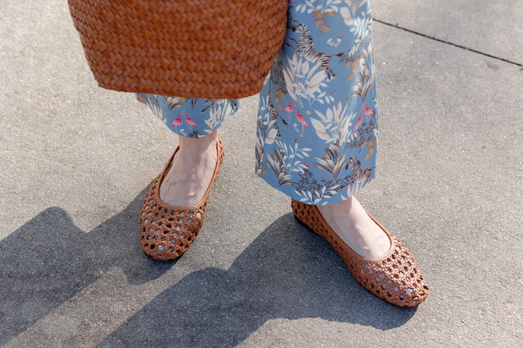 Both the woven shoulder bag and woven ballet flats bring in texture rather than color, which is exactly what you want when the pants are already carrying the visual interest.
