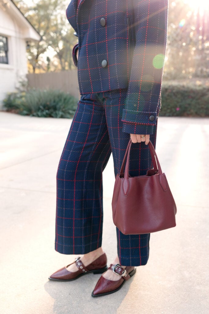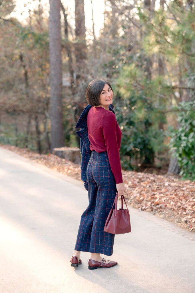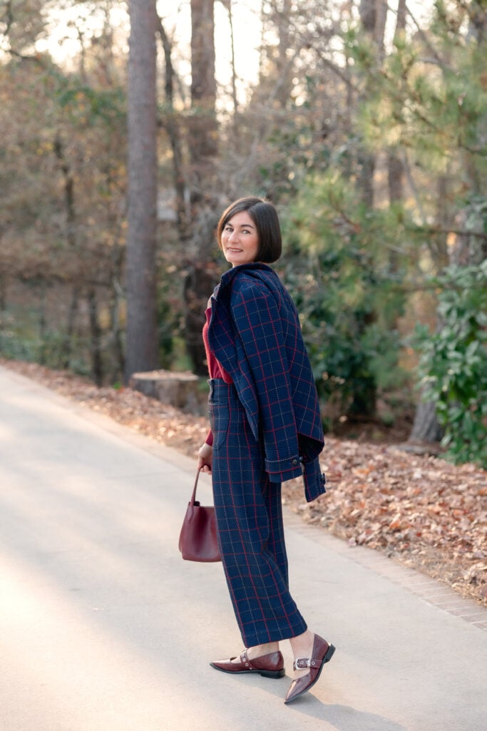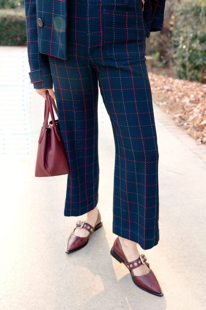 I first wore these pants, sans the jacket, in our Taste of Thanksgiving Fridays with Oscar post. For that look, I played up the navy color palette with a navy sweater and added a pop of red with my Greta Ballet Flats to tie into the red stripe in the plaid. This styling played up the navy in the plaid and created a more monochromatic look that was still interesting because of the red accent.