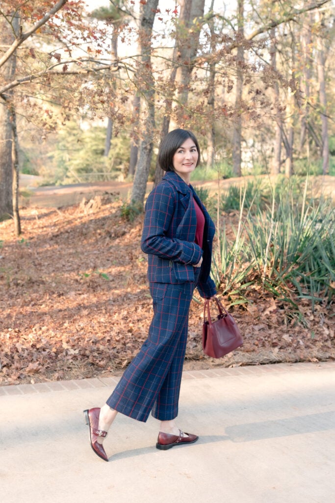 ✨ Kelly’s Petite Style Tip: When wearing a matching suit as a petite, break it up with a contrasting color in between (like this burgundy sweater). This prevents the suit from looking too uniform and adds dimension to your outfit. It also creates horizontal color blocking, which can actually be flattering when done intentionally.