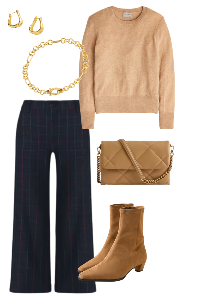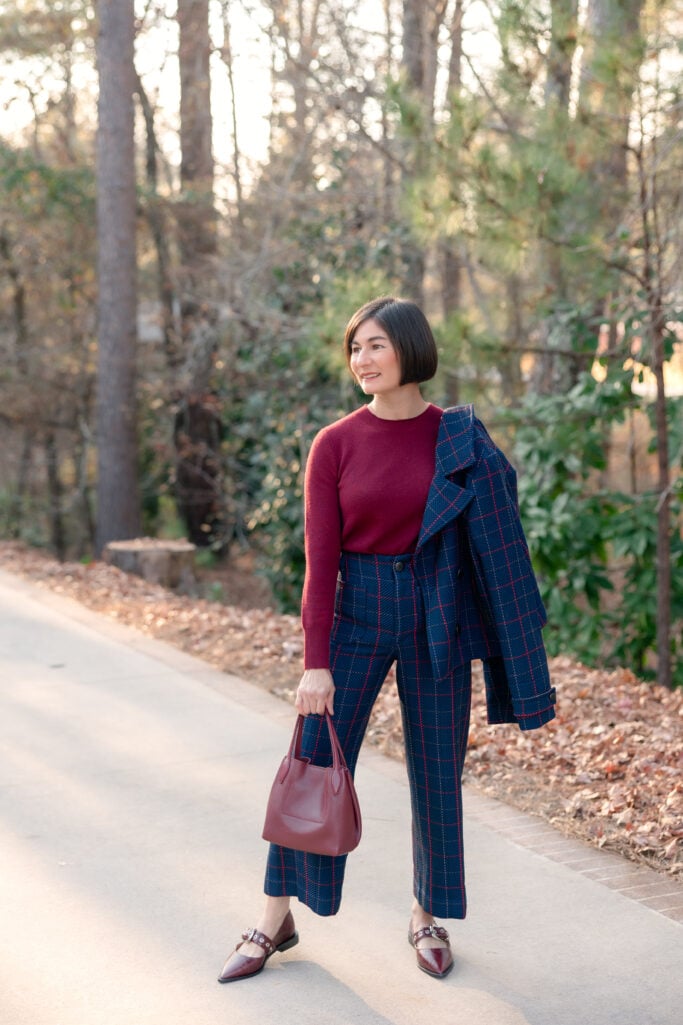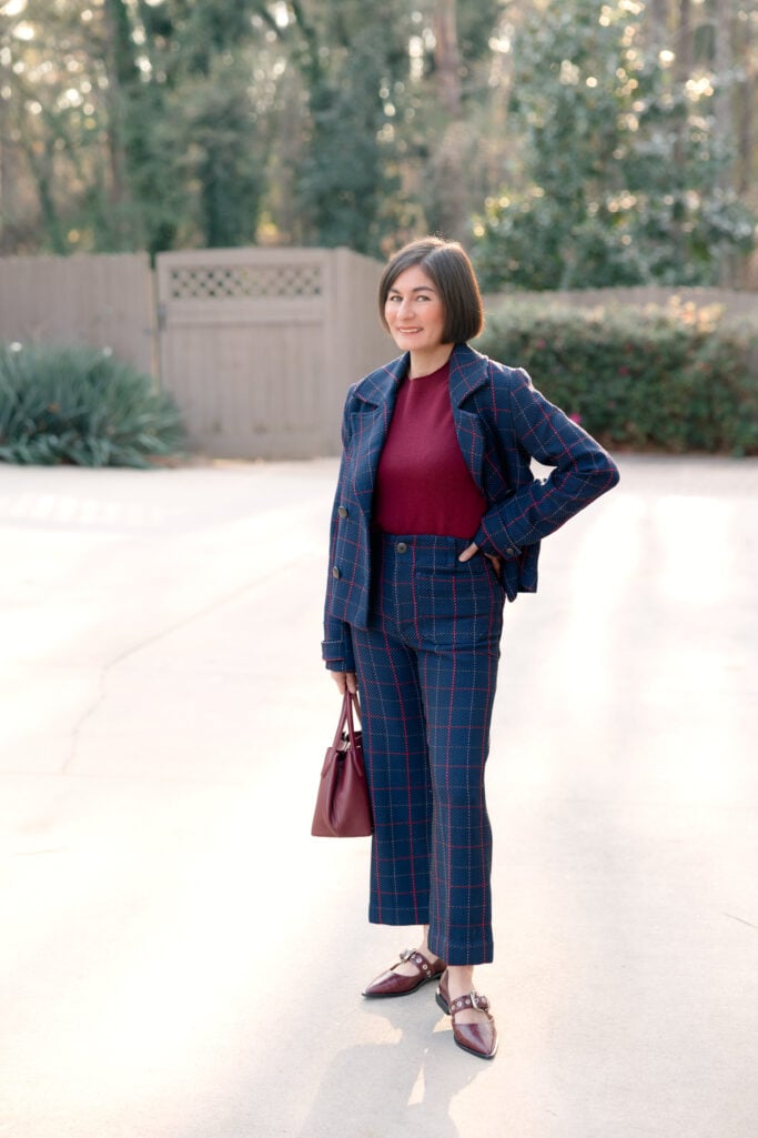 I am a big fan of versatile plaid suiting, and the Maeve Colette Knit Crop Pants from Anthropologie have become one of my favorite pieces this season. When paired with the matching plaid blazer and a classic cashmere sweater, this navy windowpane plaid suit is both professional and stylish—but here’s what I really love: it doesn’t feel stuffy or overdone.