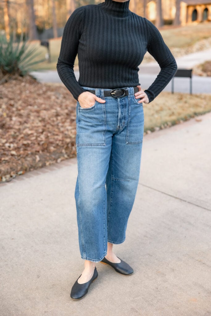 You’ll notice I’m wearing the same black J.Crew Wide Rib Cashmere Turtleneck with all four jean styles in this post—and that’s intentional. By keeping the top consistent, you can really see how each denim silhouette fits and flatters petite proportions differently. It’s a simple way to compare the barrel leg’s relaxed curve against the bootcut’s subtle flare, or the straight leg’s clean line versus the trouser’s dramatic width. Same top, four completely different vibes—proof that the right jeans can transform your entire look.