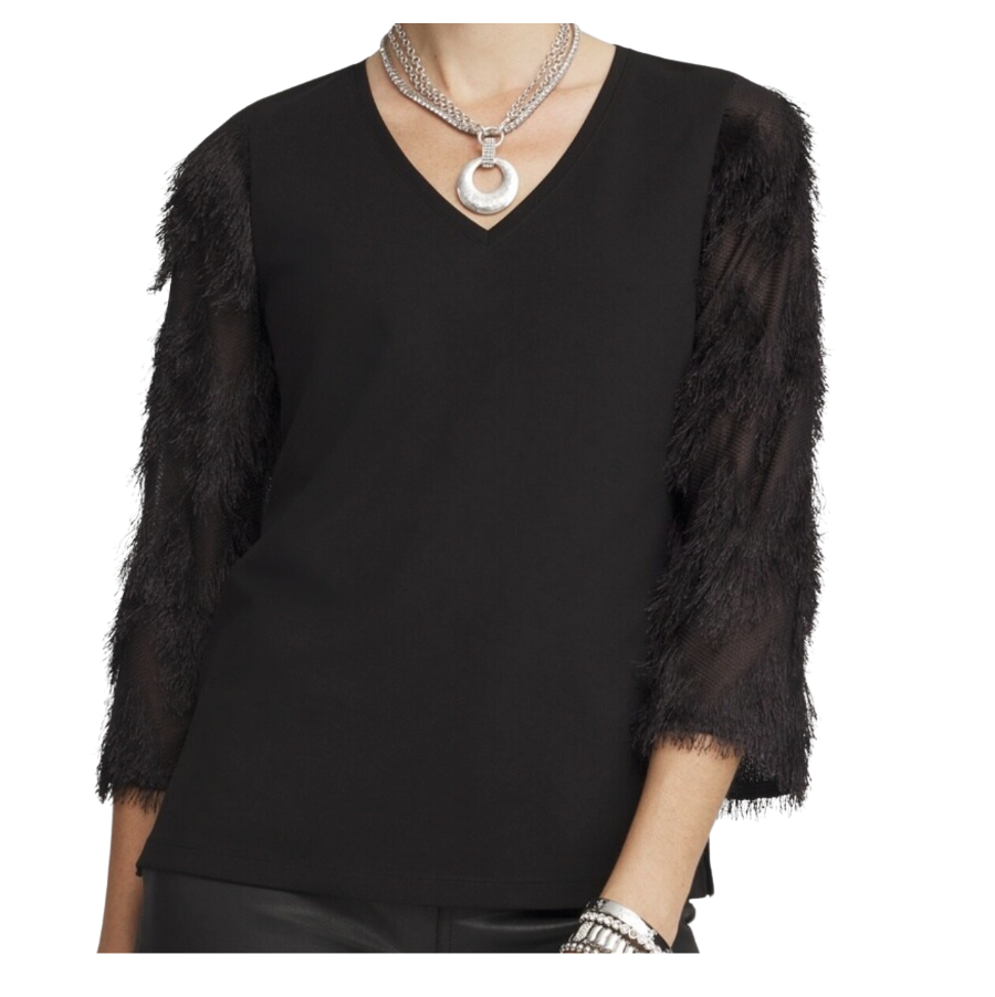 Embellishments like studs and sequins, are showing up on everything this season. Studded Ballet Flats are big, as are embroidered and embellished denim. Another big big trend this year is fringe. It’s seen its way into collections since last fall and winter, but this year fringe is more wearable than ever, just look at the Fringe Sleeve Ponte Top – it’s not western, but it is chic and elegant.