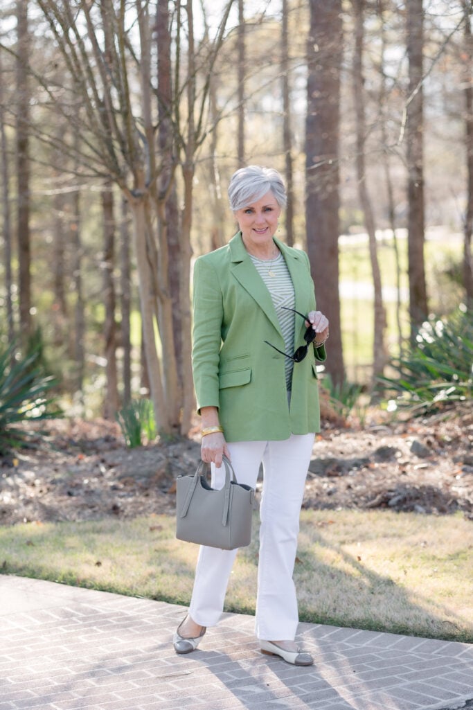 ✨ Beth’s Style Tip: If you’re adding a statement-color blazer, let one accessory echo it subtly — here, the striped tee picks up the green so the look feels cohesive rather than like a blazer thrown over an outfit.