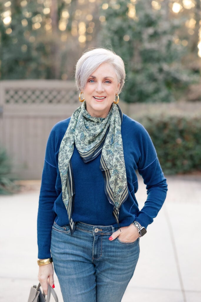 The Classic Blazer + Jeans — This is the outfit every woman over 50 already owns some version of. Part of what I like to call the 4 Bs: Blazer, Blue Jeans, Button Down, and Ballet Flats. A structured blazer, a fitted top underneath (crewneck or button-down), denim, and, depending on the weather or season, loafers, low heels, boots, or ballet flats. It says, “This is timeless, and it’s not going anywhere.”