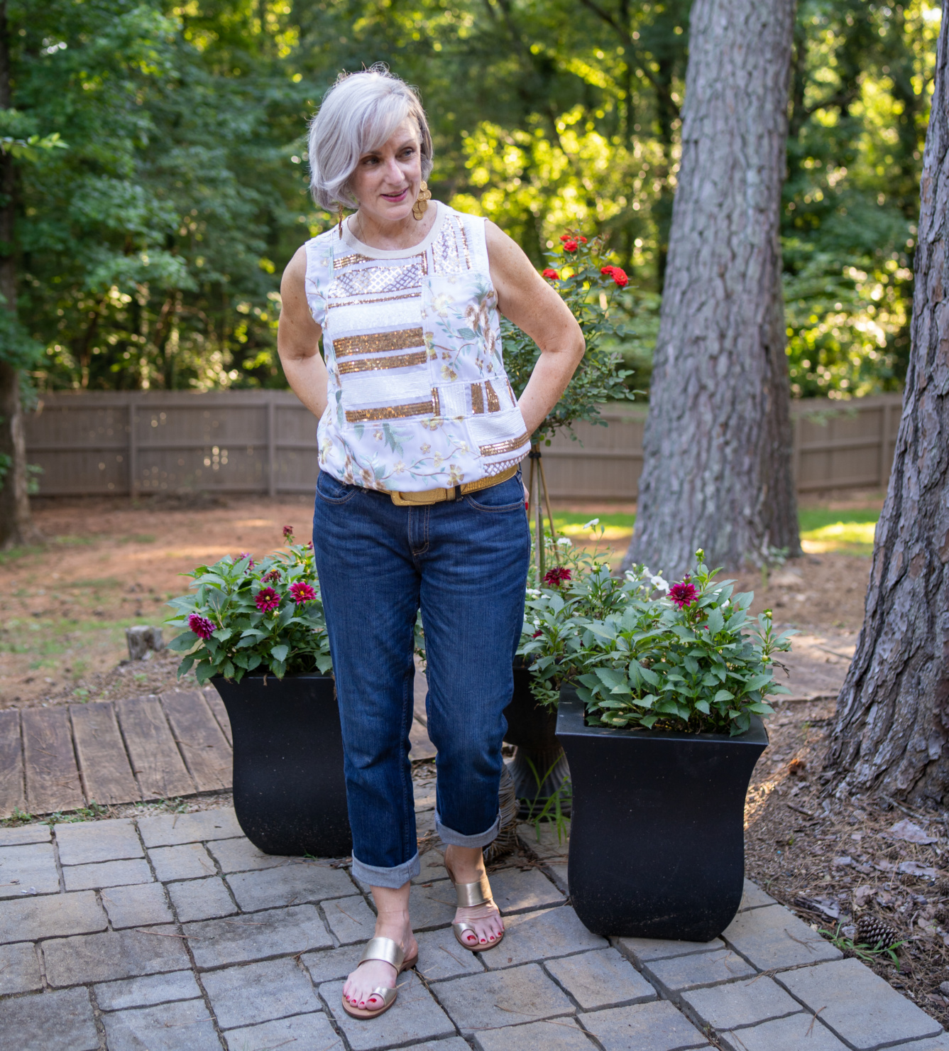 I don’t normally like shorts on women our age, but I found your ivory sequins-‘n-peachy outfit very pretty and much more flattering than the girlfriend jeans look. Maybe because the former flowed visually and enhanced your coloring? Made me want to pull out my dressier tops, casual bottoms and see what I could create. Thanks!