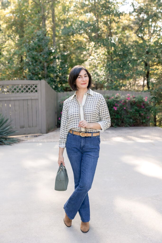 To build this outfit, I started with the Jules Classic Fit Shirt in Foulard Print from J.Crew. The tailored cut keeps things crisp, while the geometric pattern adds just enough visual interest. It’s a polished take on a classic button-up — easy to wear tucked or untucked.