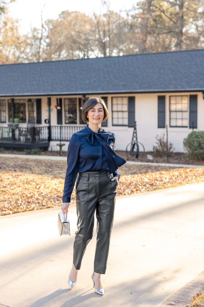 DO WEAR: Washable Silk Tie Neck Blouse | Similar Faux Leather Pant | Hazel Pointed Toe Pump | Similar Mirror Silver Bag | Alternate Mirror Silver Handbag