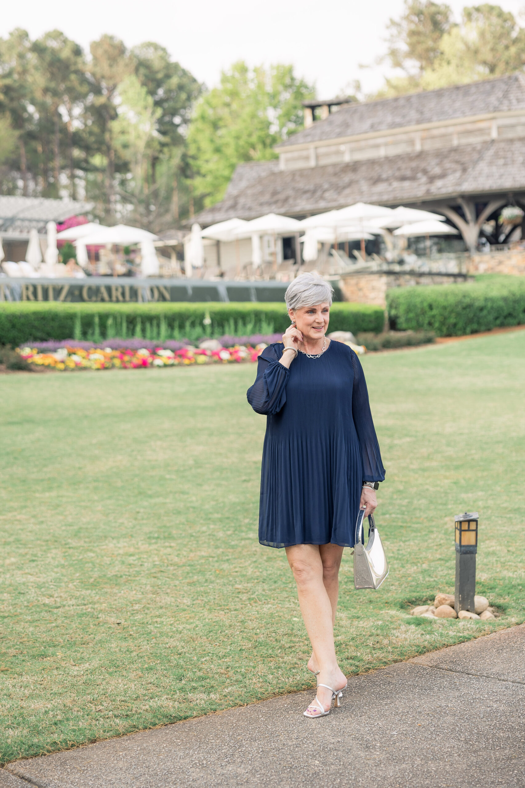 The second dress is fun and flirty, made for movement with long sheer sleeves and pleats. It compliments any figure and is lined and machine washable. Reviewers have mentioned that it runs large, but I chose my regular size medium and am happy with the fit.