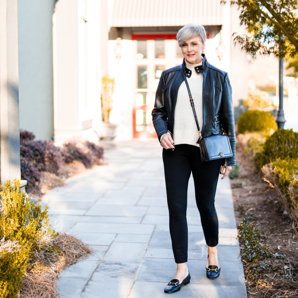 A structured moto jacket is one of the best toppers for leggings because it provides shape and polish. Pair with a tunic-length sweater underneath and ankle boots. This is my go-to errand-running outfit when I want to feel put together without too much effort.