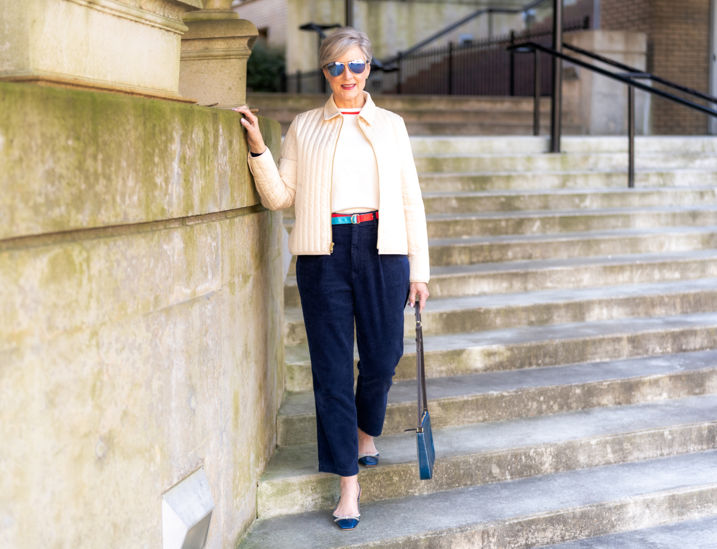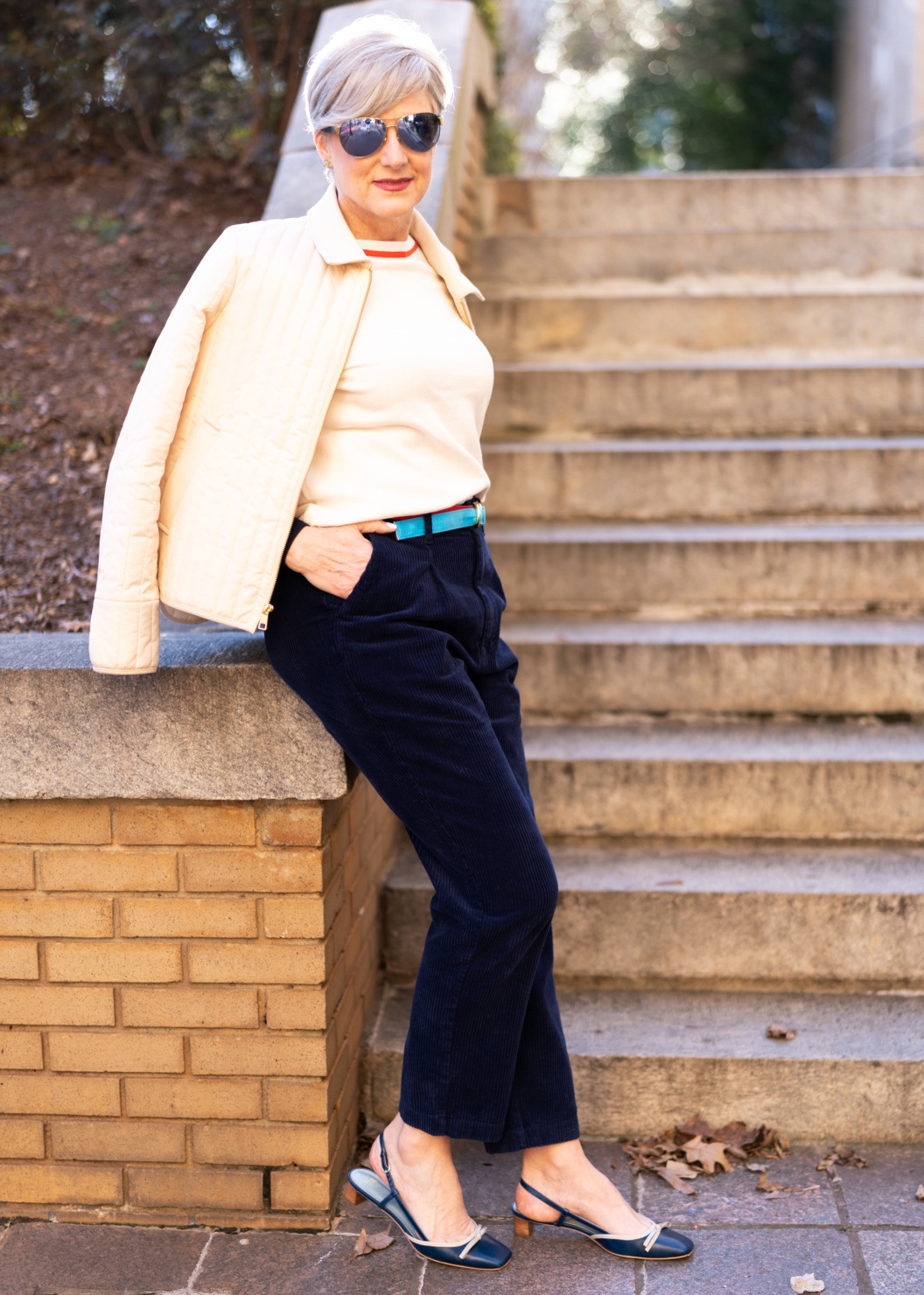 many of you may be resistant to wide-leg pants, pleats, and or roomy trousers. heaven forbid we look ummmm bigger. isn’t style all about looking as young and thin as we can? heck no! style is all about experimenting and having fun. incorporating trends into our wardrobe keeps us modern, fresh, and relevant. today, i’m wearing the cutest corduroy pants (size 8) from Alex Mill that have a fitted waist, pleats, and a roomier leg. since it’s on the chilly side, a sweater from Boden (sold out, similar here, here, and here) is the perfect companion. this channel-stitched jacket (size medium) from Banana Republic is the perfect third layer that keeps me warm and stylish. love the neutral color. lately, i’m obsessed with all things Frances Valentine, an upscale retailer founded by Kate Spade. it’s pricey, so i will link alternative selections. but i LOVE their shoes and now own three pairs. whenever i wear Frances Valentine shoes on Instagram, i’m immediately deluged with DM’s asking about them.