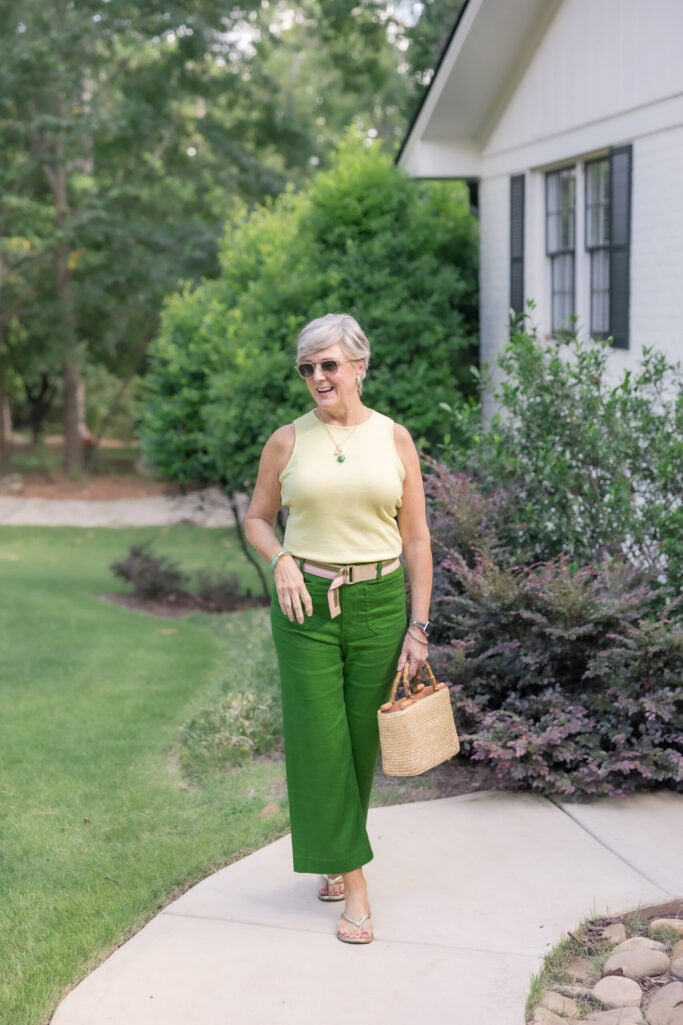 The Formula: Linen wide-leg pants + tucked tank or breezy blouse + flat sandals or espadrilles + straw bag