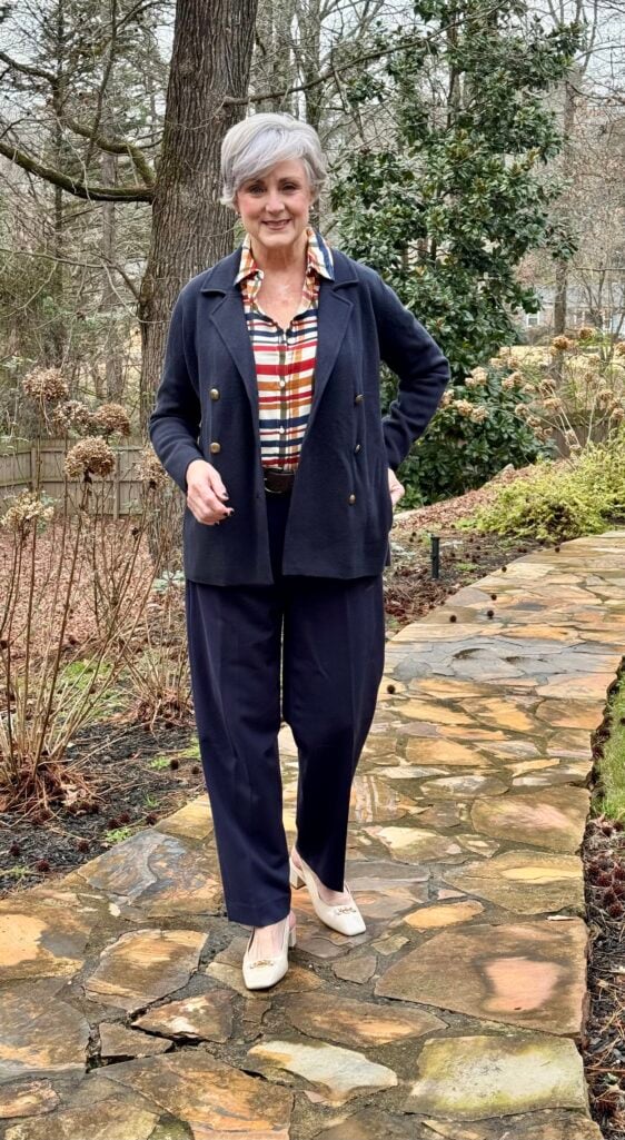 Patterned silk shirt + navy trousers + navy sweater blazer + block heels