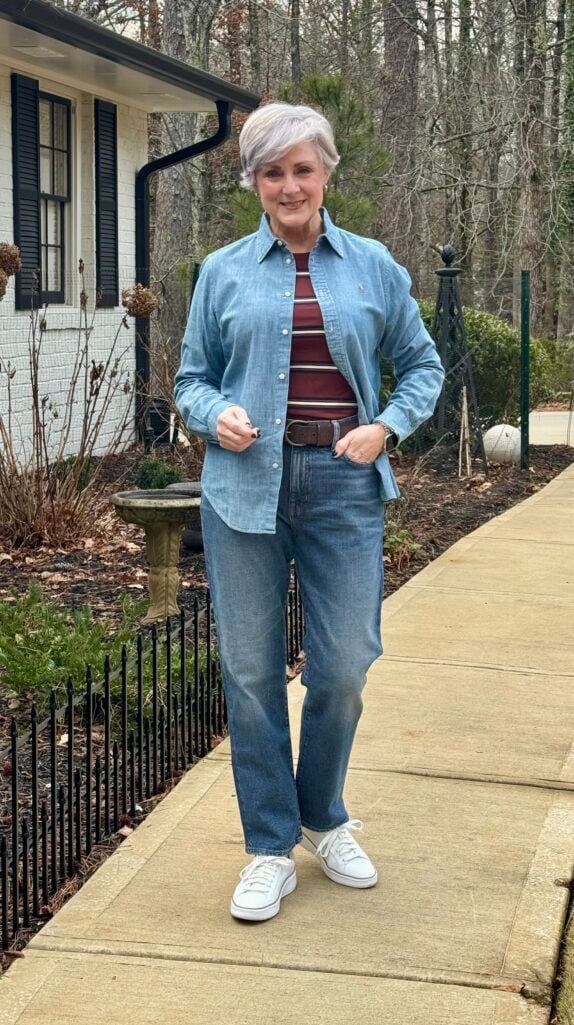 Chambray shirt worn open + striped tee + straight-leg jeans + sneakers