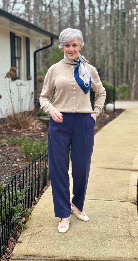 - Cardigan (buttoned) + navy trousers + loafers