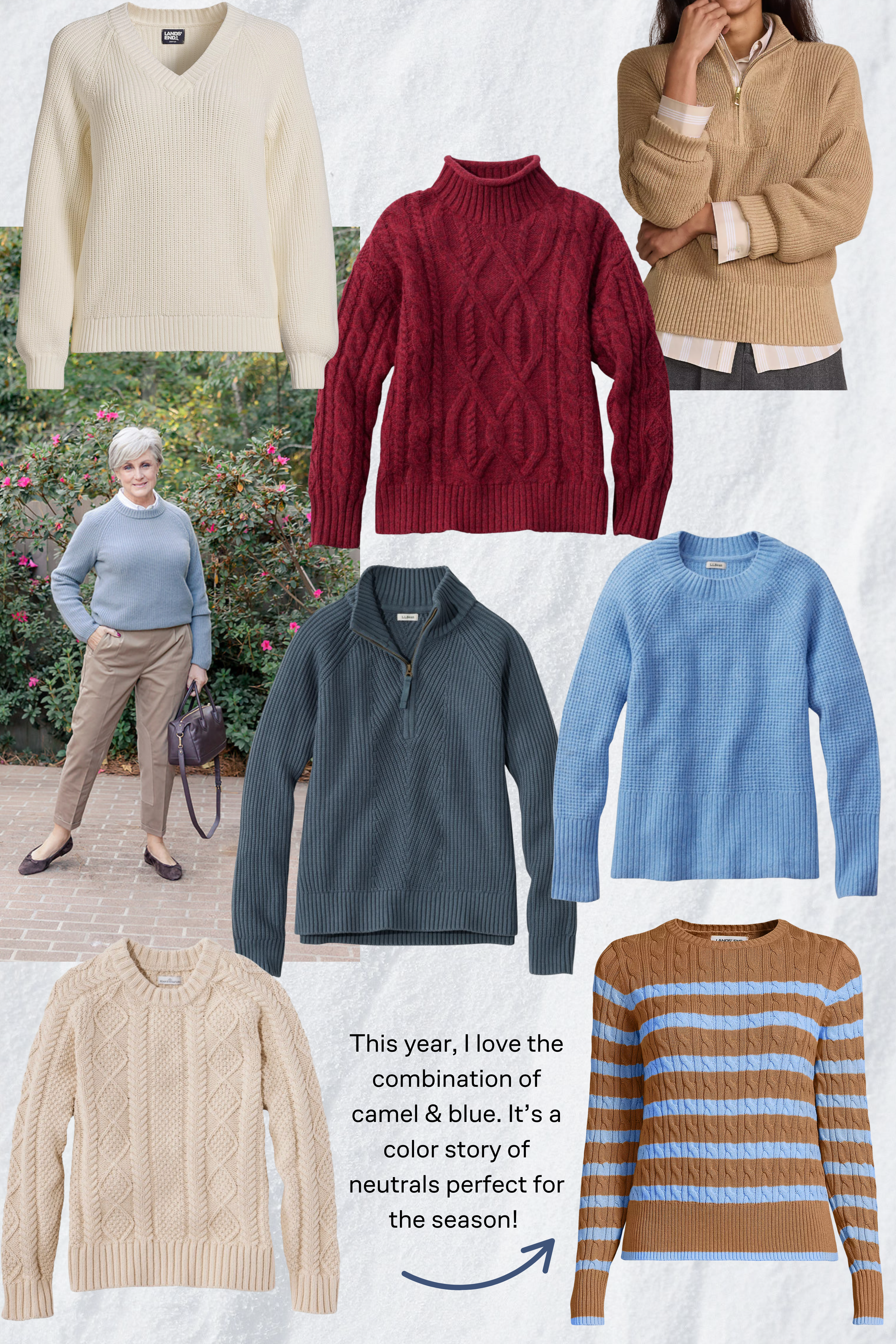 A chunky cable-knit or ribbed sweater instantly brings cozy sophistication to your look. Go for neutral tones — cream, oatmeal, gray, or soft blue — that mix well with jeans, skirts, or trousers. Tuck it into jeans for a casual brunch, or layer it under a blazer for polished warmth.
